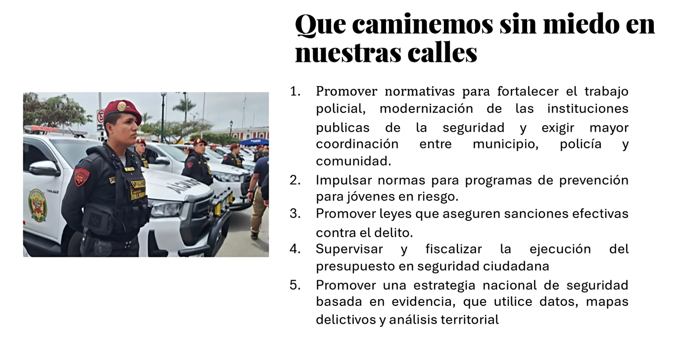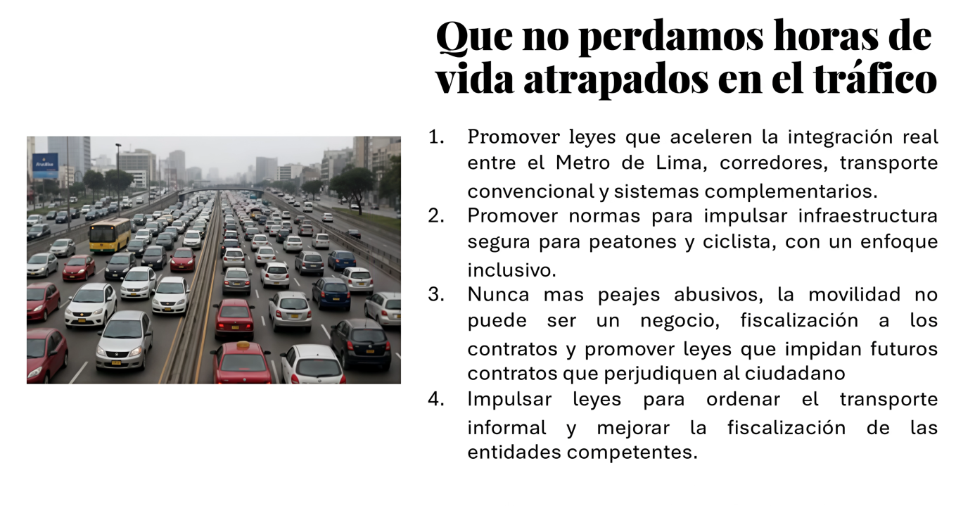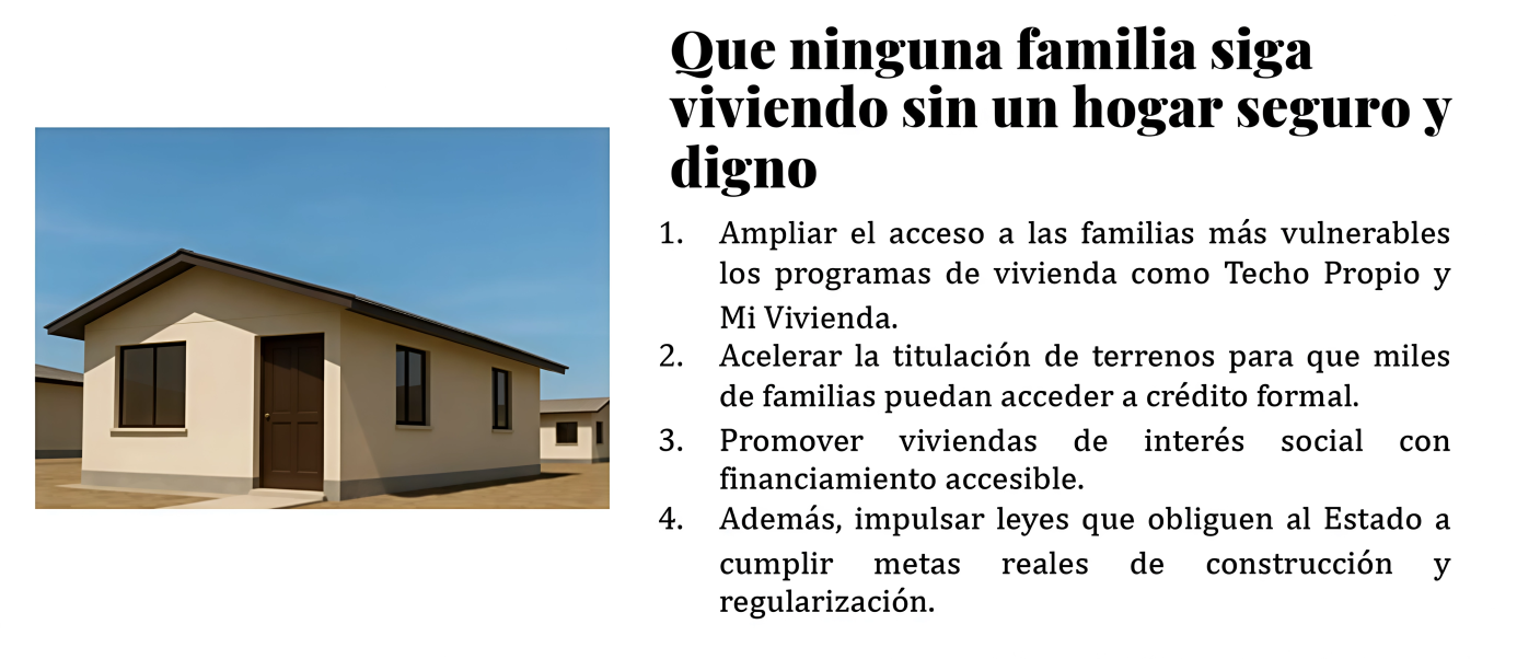 En Lima hay miles de familia que viven sin una casa digna y segura, yo conozco esa lucha, lo he vivido de cerca, se que es empezar de cero. Por eso mi compromiso es claro: trabajar para que cada familia tenga acceso real a una vivienda digna, porque un hogar no es un lujo, es el inicio de todo.